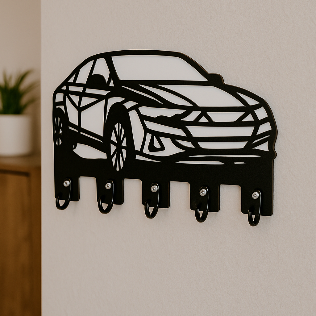Siyah-beyaz kontrastlı araba figürü, araba tutkunları için özel bir anlam taşırken, geometrik kesimler sayesinde ürüne derinlik ve modern bir görünüm kazandırır. İnce lazer kesim detayları ile hazırlanmış bu tasarım, hem estetik hem de işlevsel bir ev aksesuarı olarak öne çıkar.